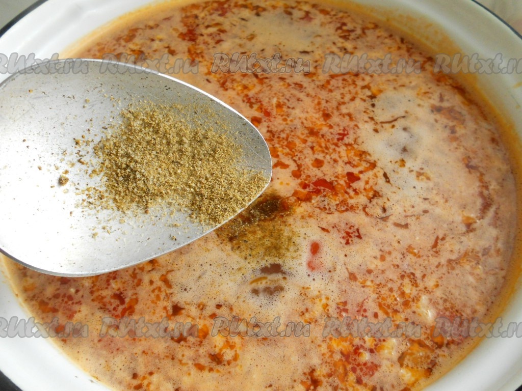 А теперь главное - добавить все специи. Всыпать хмели-сунели, смесь перцев и сванскую соль (это тоже грузинская смесь специй из Сванетии - очень ароматная).