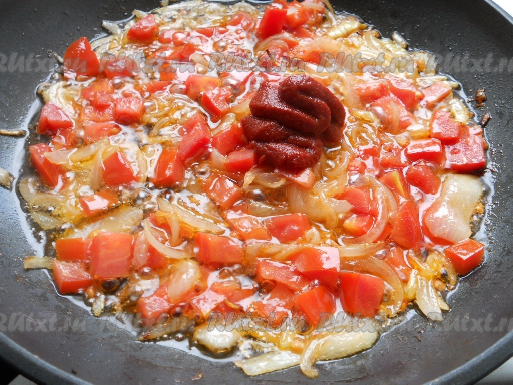 Добавить к луку порезанные небольшими кубиками помидоры (кожицу можно удалить) и томатную пасту. Обжаривать на небольшом огне до образования соуса.