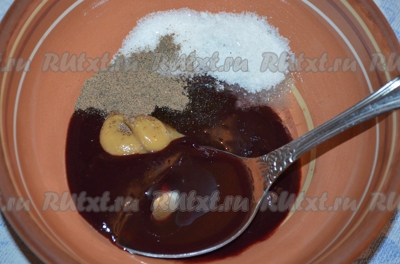 Приготовить маринад. Смешать ткемали, масло, соль, сахар, перец, горчицу.