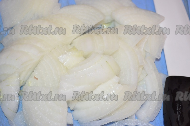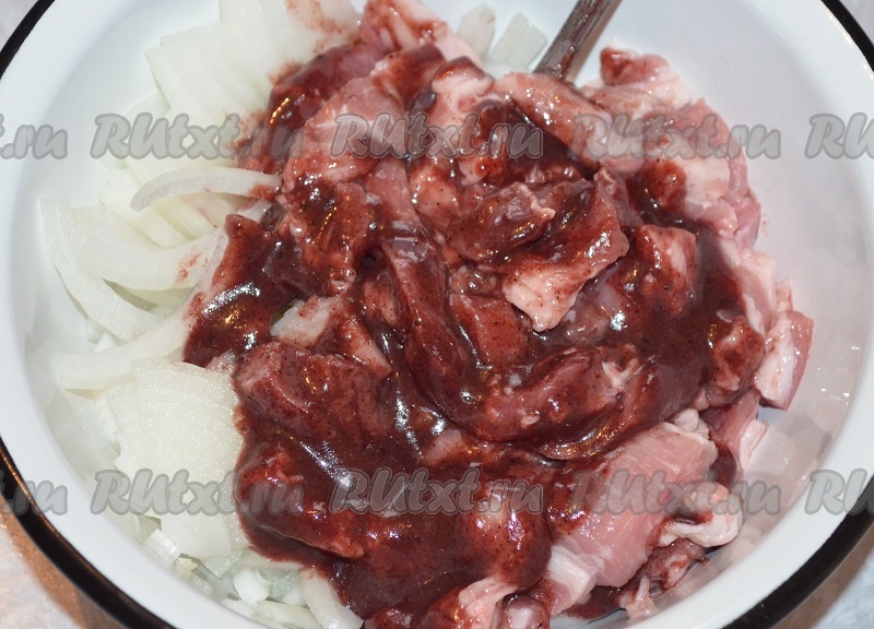 Перемешать маринад, мясо и лук. Оставить на 2 часа не в холодильнике.