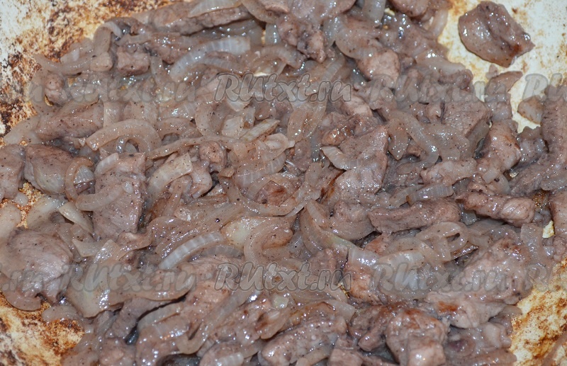 Подрумяненное маринованное мясо с луком накрыть крышкой, и, опять же помешивая, на медленном огне довести на сковороде до готовности, примерно 15-20 минут.