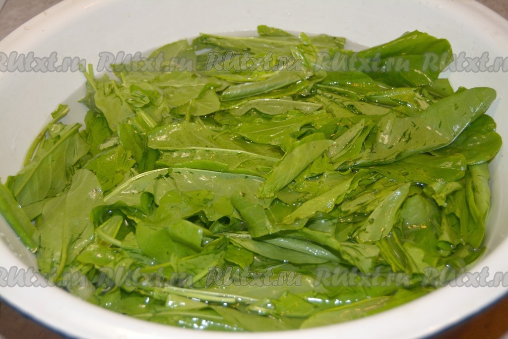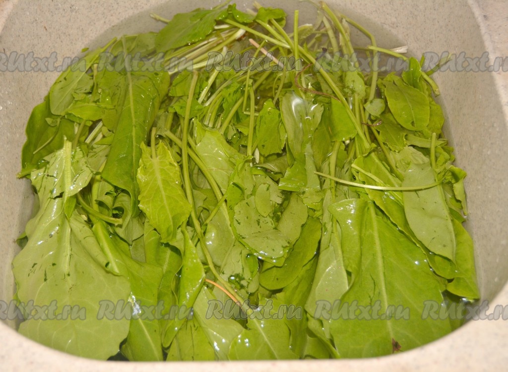 Щавель перебрать, стебли выбросить (они грубоватые), оставить только листья. Листья щавеля замочить в большом количестве холодной воды. Лучше всего это сделать в раковине. Оставить на 10 минут.