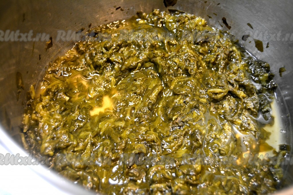 Через 5 минут можно выключить огонек. За это время листья щавеля дадут сок, уменьшатся в объеме.