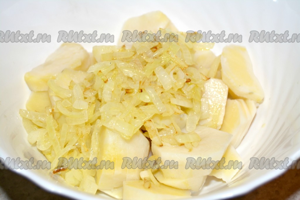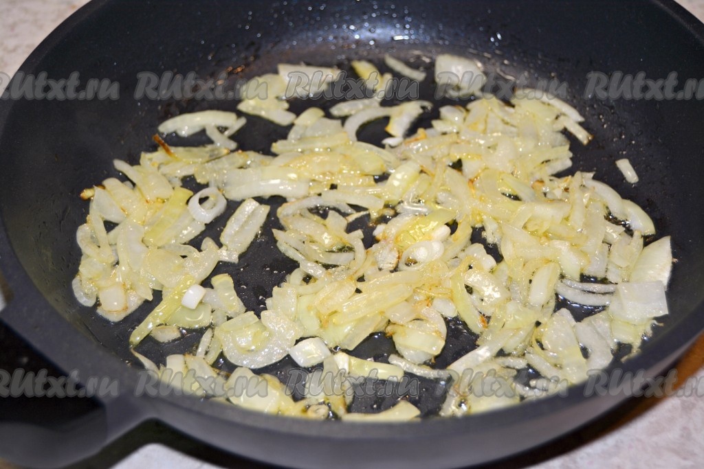 Лук репчатый мелко нарезать и обжарить на оливковом масле до легкой золотистости.