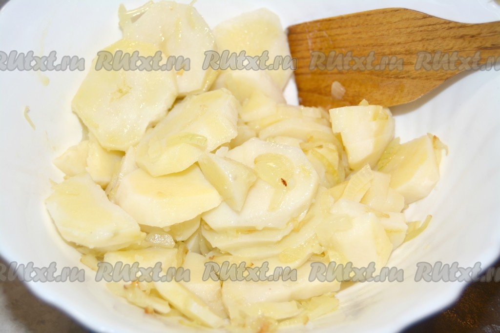 Картофель отварной холодный нарезать кружочками и сложить в миску.