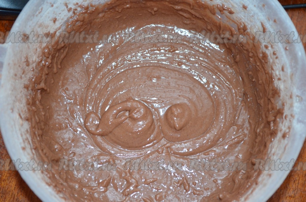 В отдельной ёмкости муку смешать с разрыхлителем, какао и солью. Просеять получившуюся мучную смесь в смесь яиц и масла, перемешать лопаткой (или столовой ложкой). Шоколадное тесто должно получиться однородным, достаточно густым.