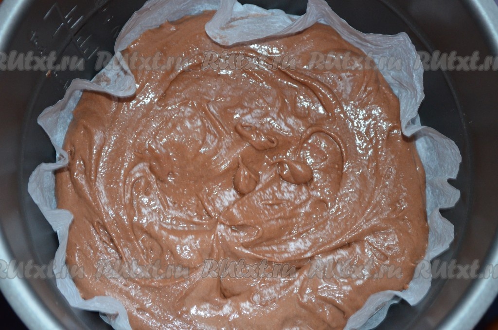 Застелить чашу мультиварки пергаментом, который должен покрывать и дно, и бока чаши, затем выложить тесто, равномерно распределить его.