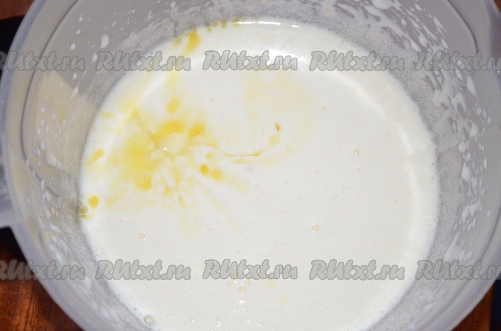 Яйца взбить с сахаром и ванилином с помощью миксера в течение 5-6 минут (яичная масса станет пышной, светлой). Затем добавить растопленное не горячее сливочное масло, взбить миксером до однородности.