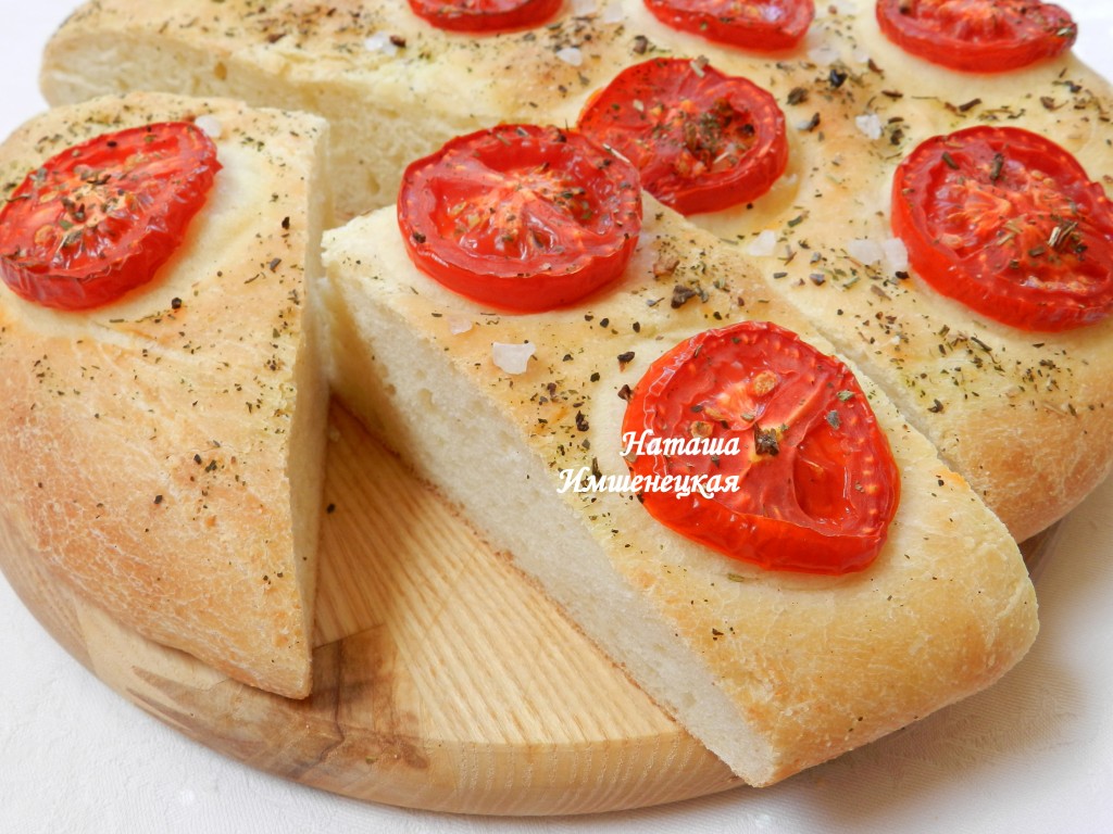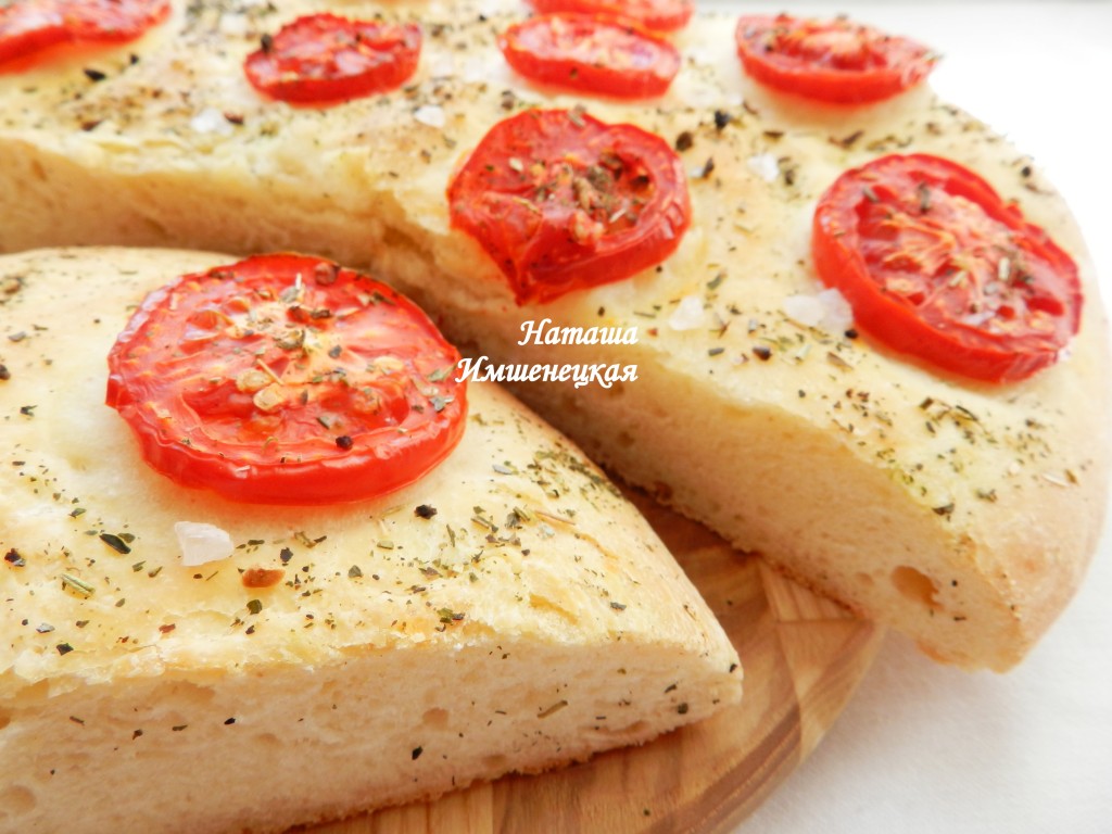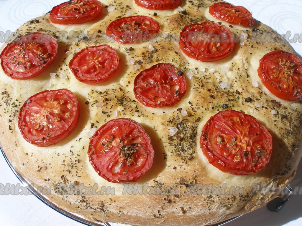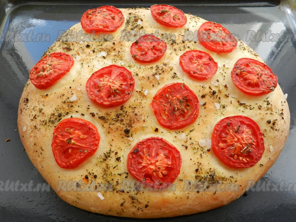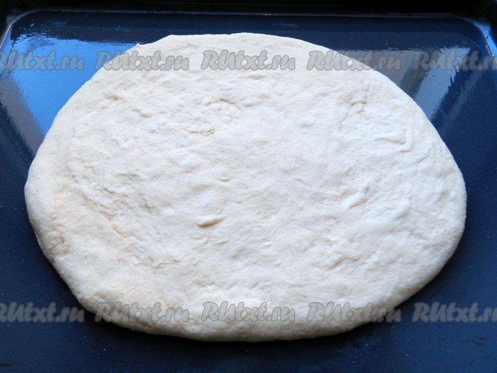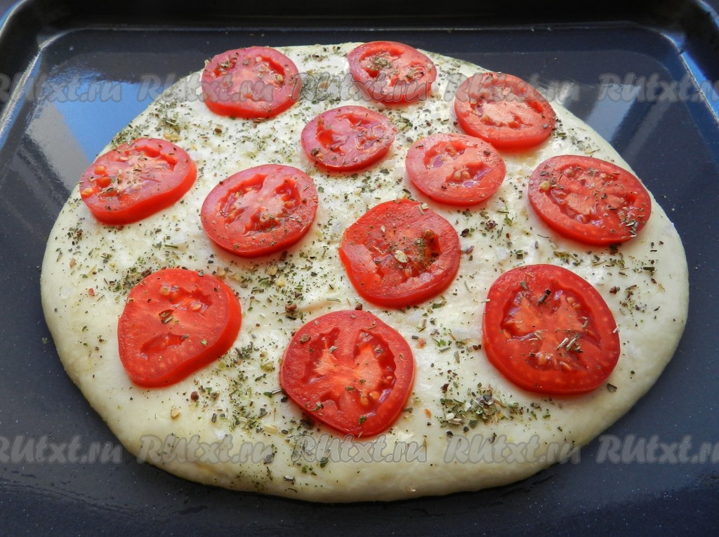 Тесто, подошедшее в хлебопечке (или в миске), выложить на противень, смазанный растительным маслом, и руками сформовать лепёшку толщиной 1,5-2 сантиметра. Прикрыть противень с тестом полотенцем и убрать в тёплое место на 30 минут для подхода.