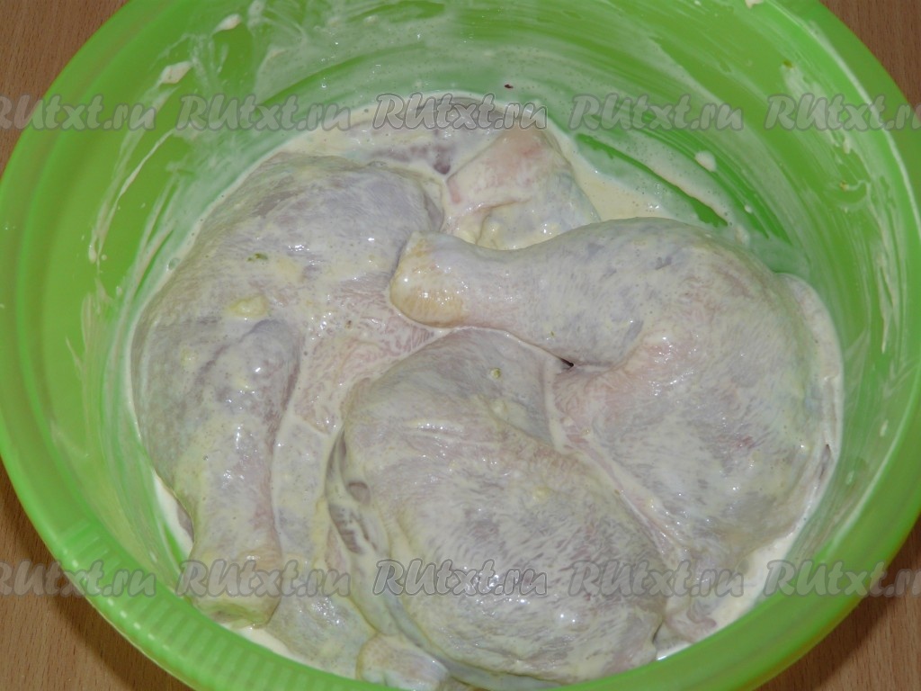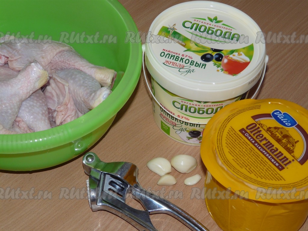 Куриные ножки посолить, поперчить. Добавить к ним майонез и чеснок, пропущенный через пресс.