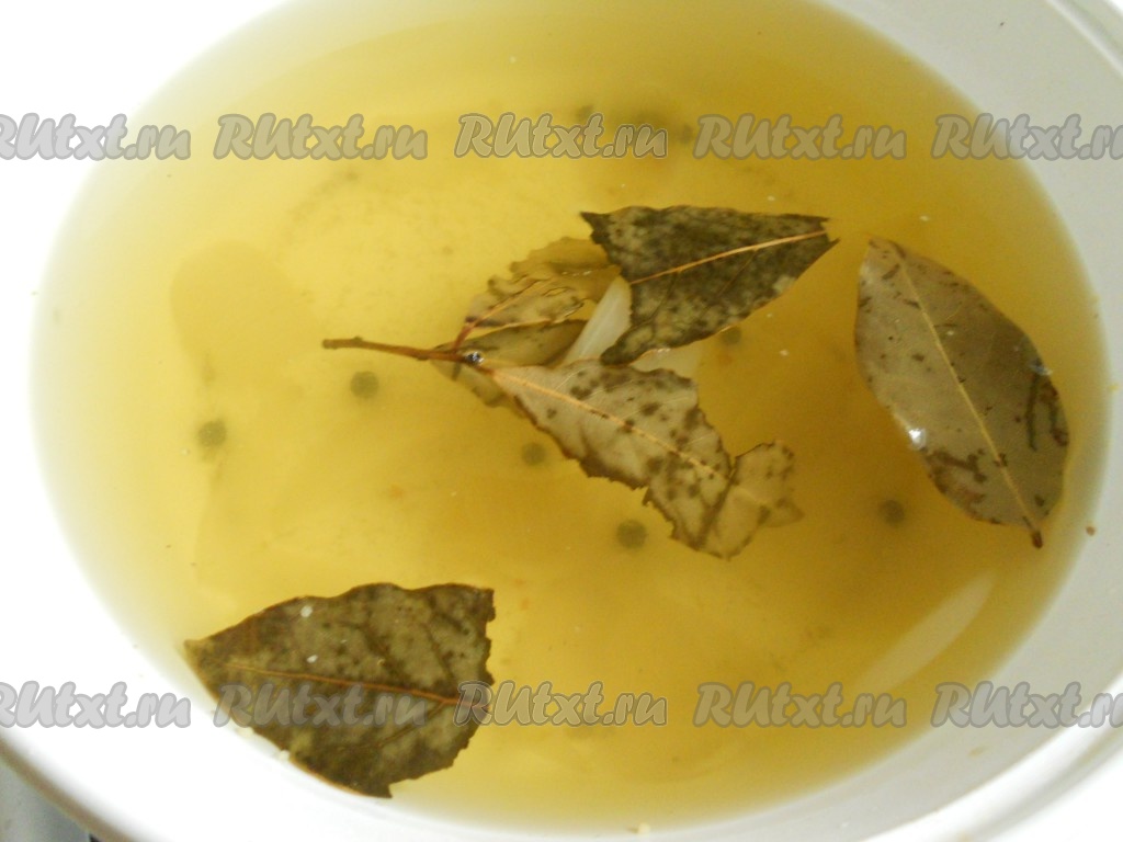 Для приготовления рассола нужно в кастрюлю влить 1 литр воды, довести до кипения, всыпать соль, добавить очищенный лук, разрезанный на 4 части, горошины чёрного и душистого перцев, лавровые листья, перемешать, ещё раз дать закипеть и варить на медленном огне 5 минут (до полного растворения соли), иногда перемешивая. Затем убрать рассол с огня, дать ему остыть. Я солила кусочками 1 крупную скумбрию, но этого количества рассола хватит и на 2 рыбки.