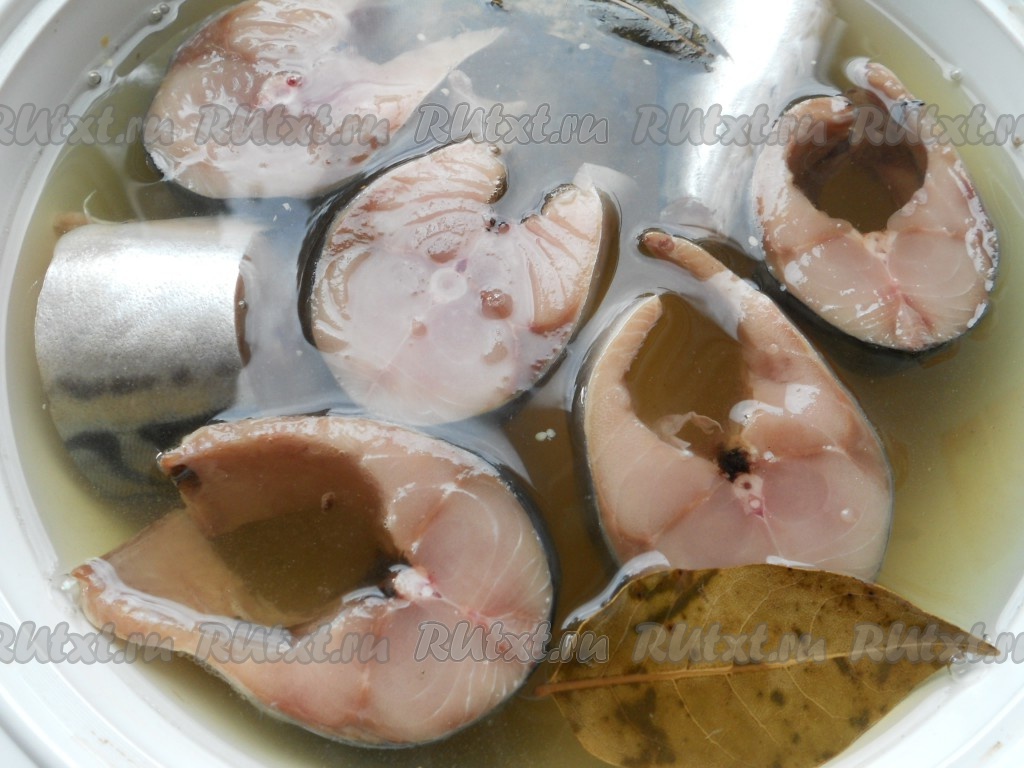 В остывший рассол поместить кусочки скумбрии (рыба должна быть полностью покрыта рассолом). Накрыть крышкой и оставить на 2 часа при комнатной температуре. Когда я солю скумбрию весом менее 500 грамм, на её просаливание хватает и 1,5 часов.