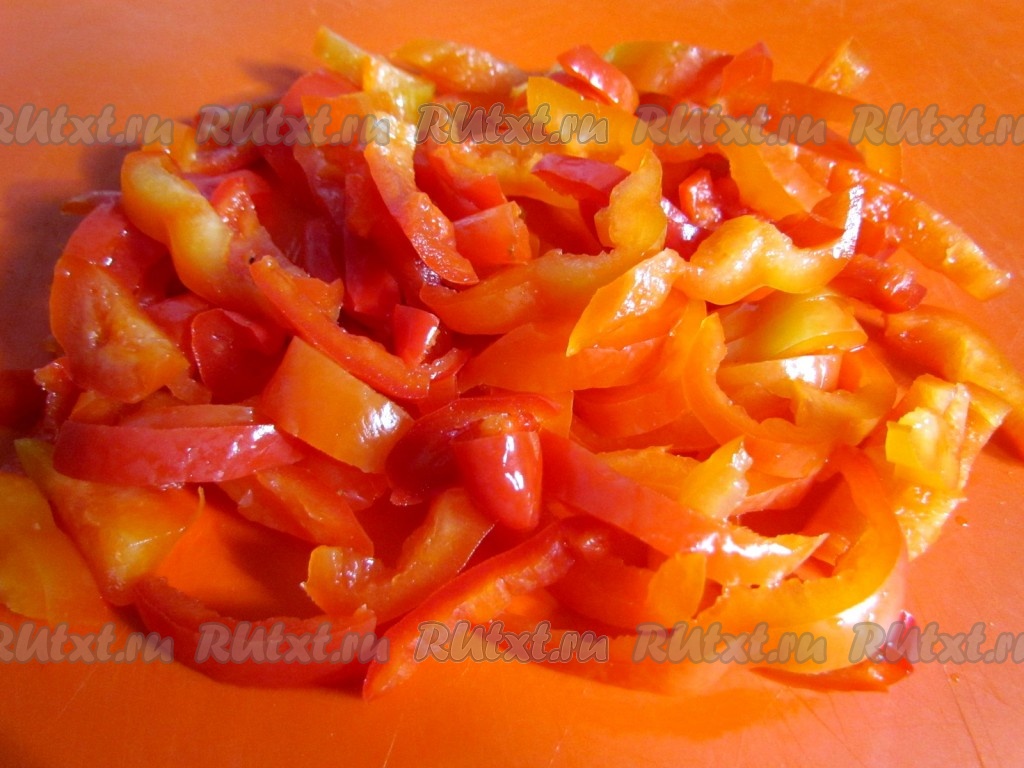 Сладкий и острый перец очистить от семян и плодоножек, нарезать тонкой соломкой.