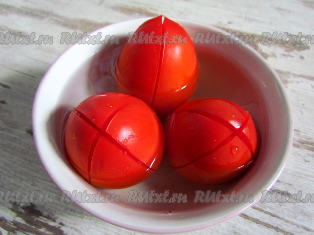Помидоры крестообразно надрезать, опустить в кипяток на 1-2 минуты, затем удалить кожицу. Нарезать очищенные помидоры небольшими кусочками.