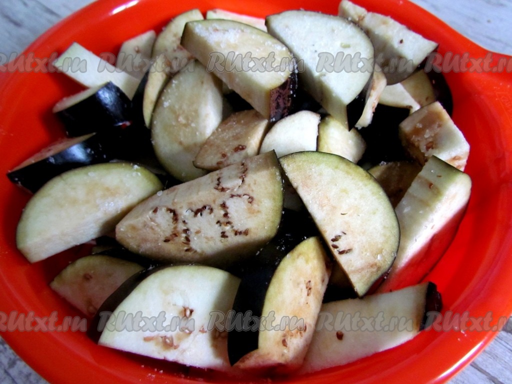 Все овощи и зелень тщательно вымыть. Баклажаны нарезать полукольцами, толщиной около 1 см. Посолить и оставить на 30 минут, чтобы выделился сок. Затем промыть под холодной водой и дать воде стечь.