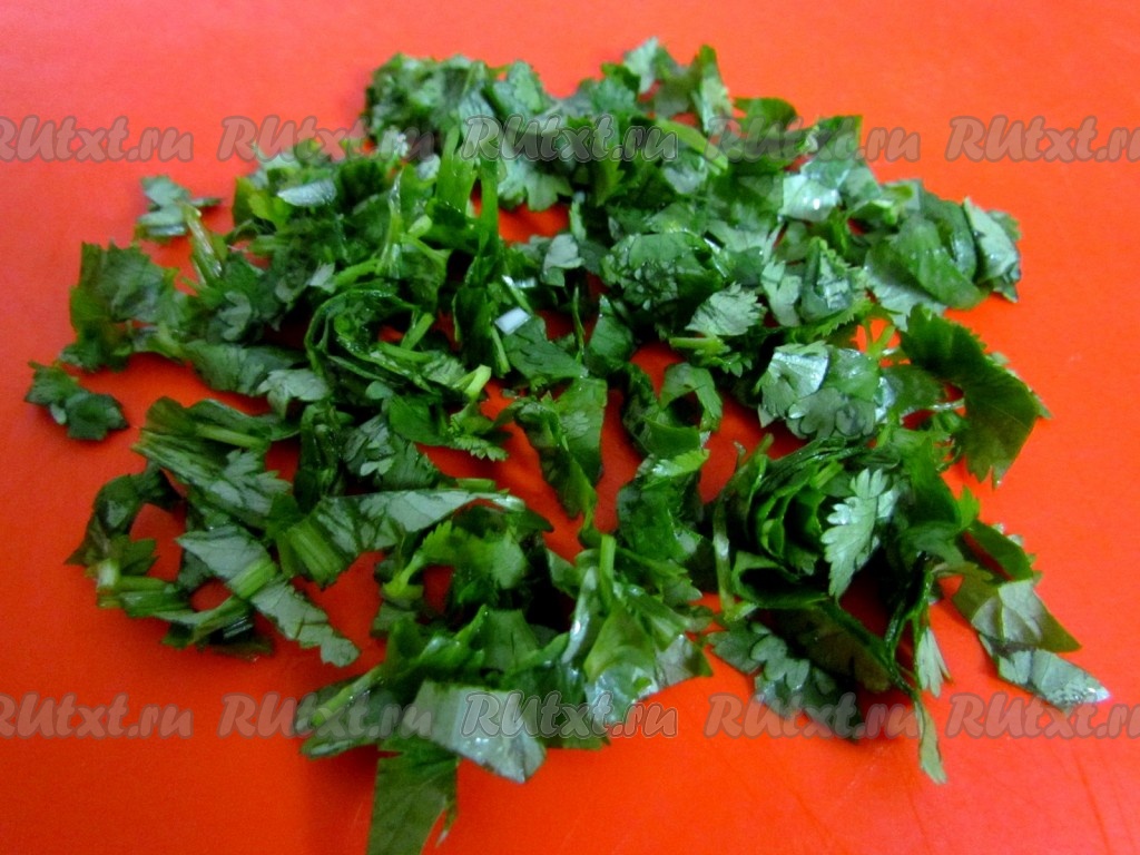 Чеснок раздавить боковой частью лезвия ножа. Зелень мелко нарезать.