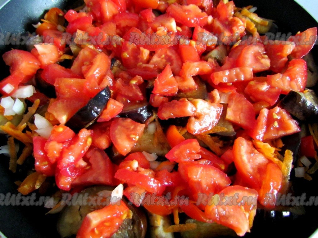 Обжарить баклажаны на разогретом растительном масле до полуготовности. Добавить к баклажанам лук, морковь, перец и помидоры. Посолить по вкусу. Перемешать, накрыть крышкой и тушить на медленном огне около 15 минут.