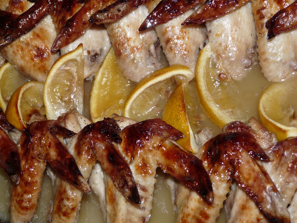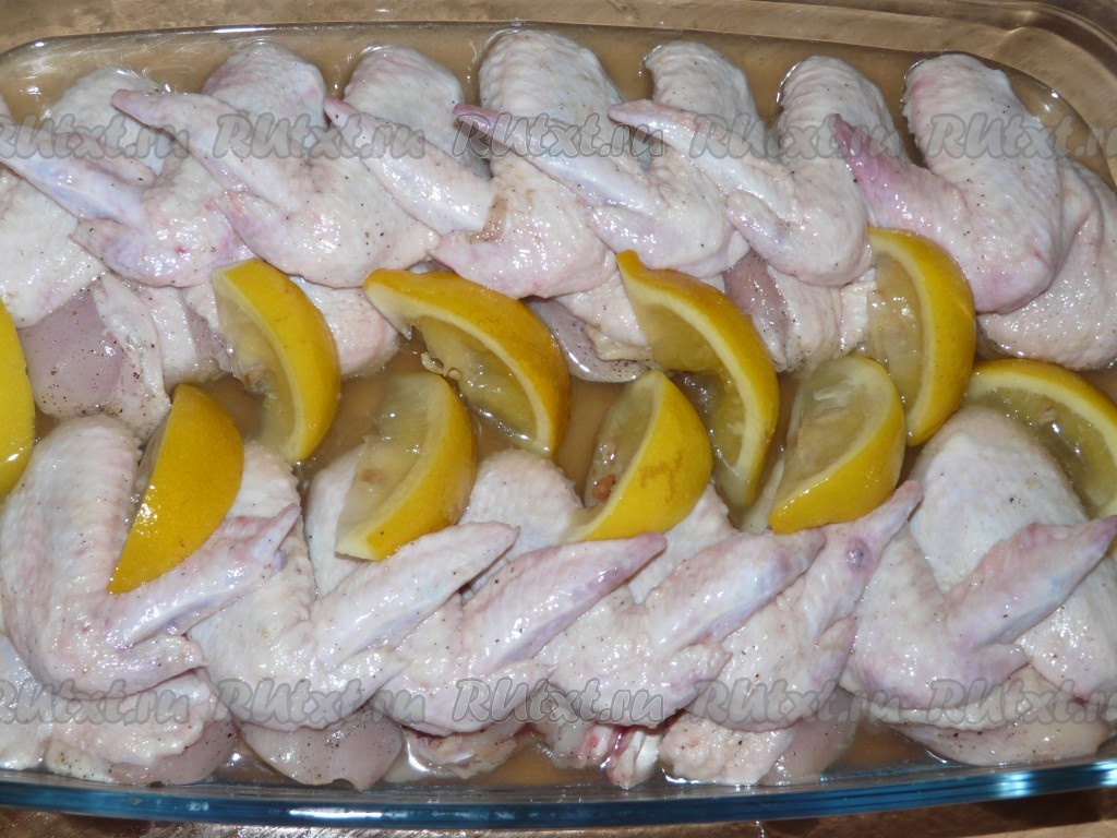 Выложить куриные крылышки в жаропрочную форму и залить их сиропом, равномерно поливая сверху крылья. Дольки лимона выложить на крылышки.