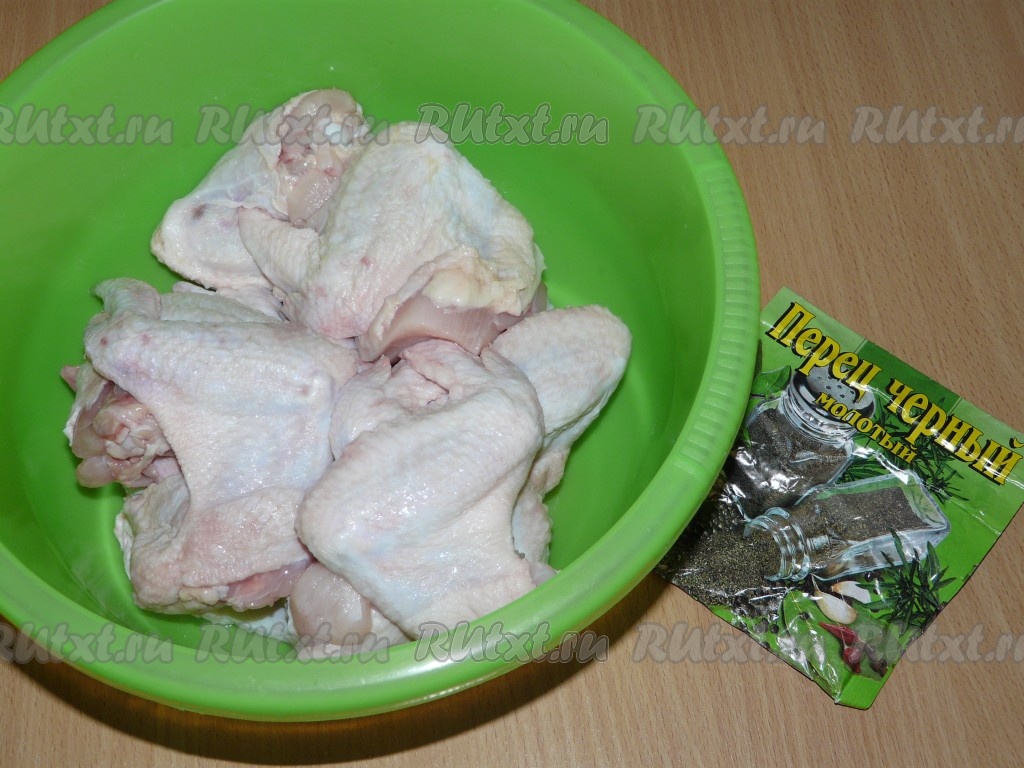 Крылышки вымыть, посолить, натереть чёрным молотым перцем.