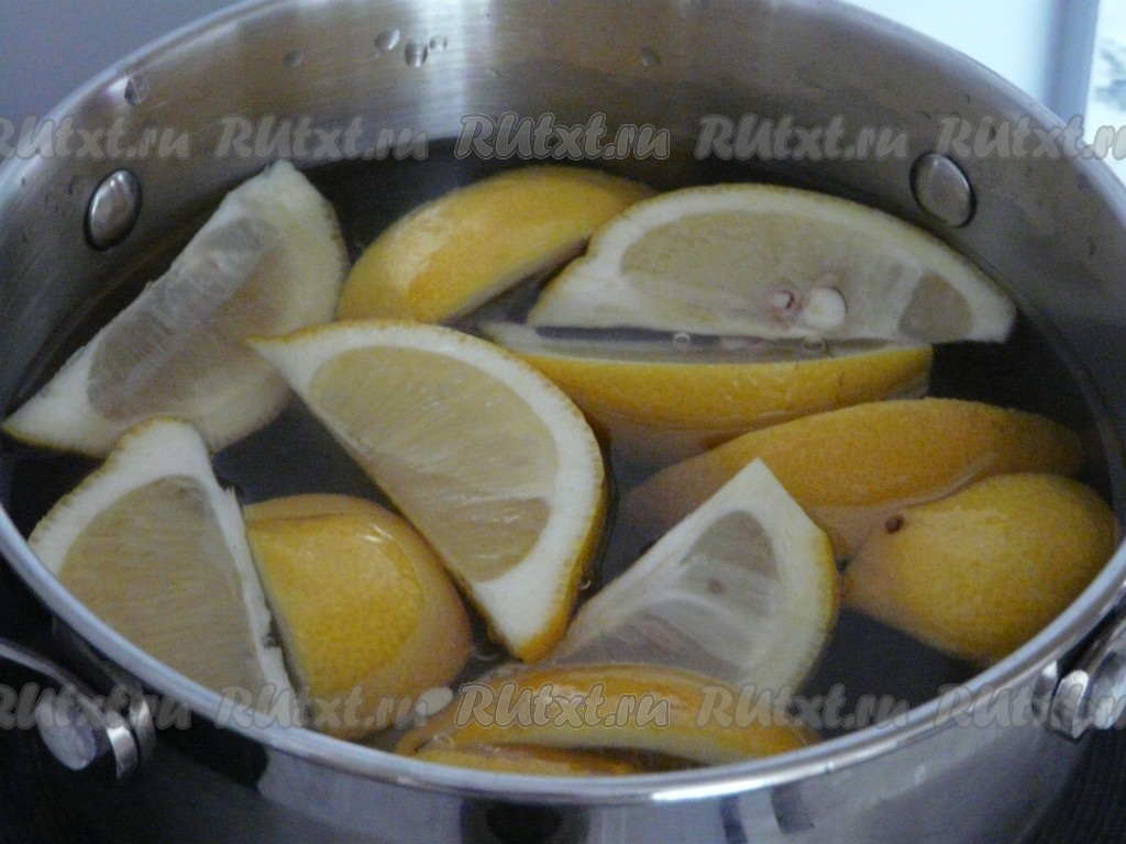Лимон тщательно вымыть, разрезать на 4-6 частей. В кастрюлю влить 200 миллилитров воды, добавить сахар и нарезанные лимоны, поставить на огонь и варить сироп с момента закипания 15-20 минут на небольшом огне.