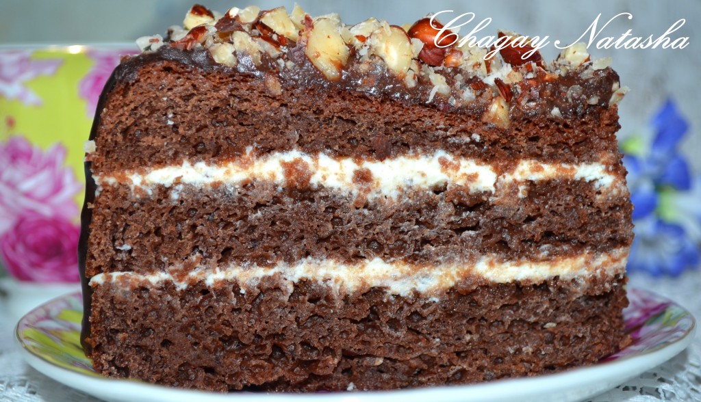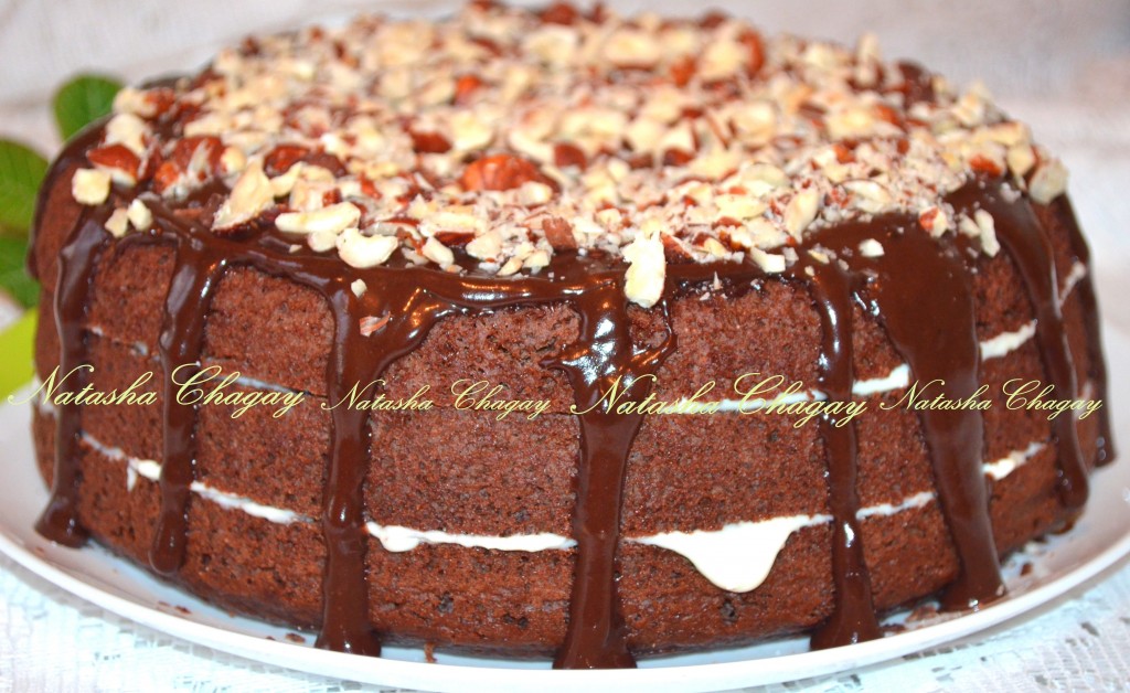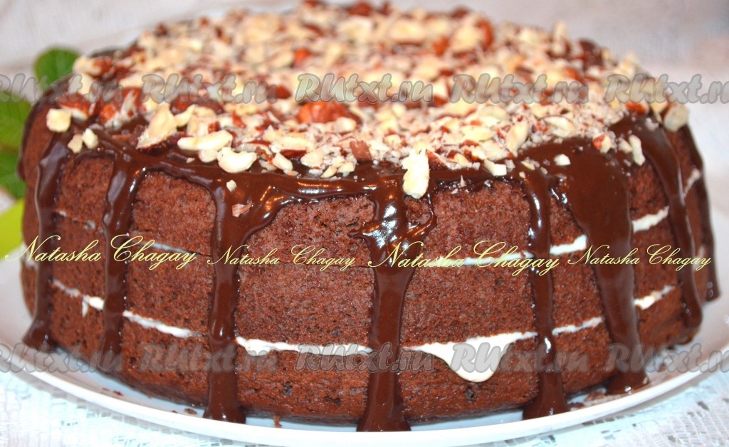 Затем распределить остальную глазурь. Орехи порубить и обсыпать ими наш шоколадно-бисквитный тортик. Оставить пропитаться (у меня торт ночь стоял в холодильнике) и можно угощаться.
