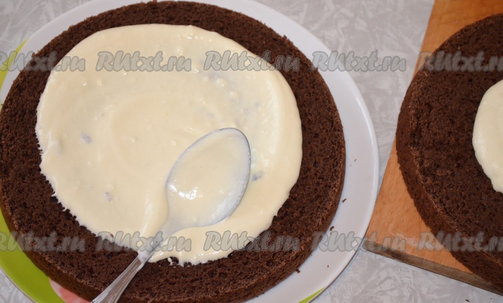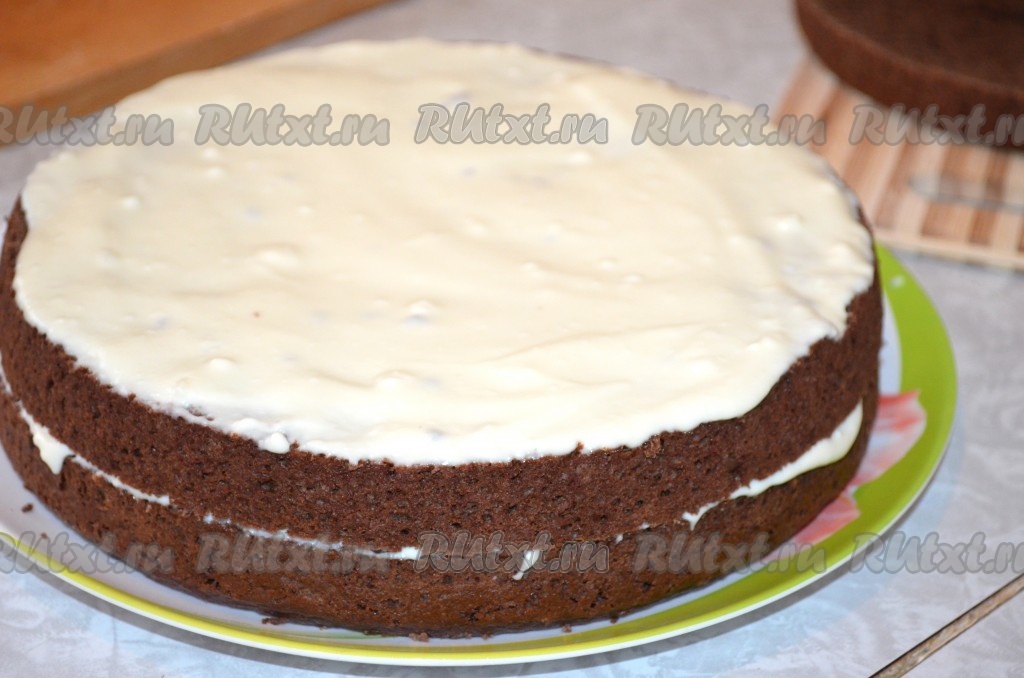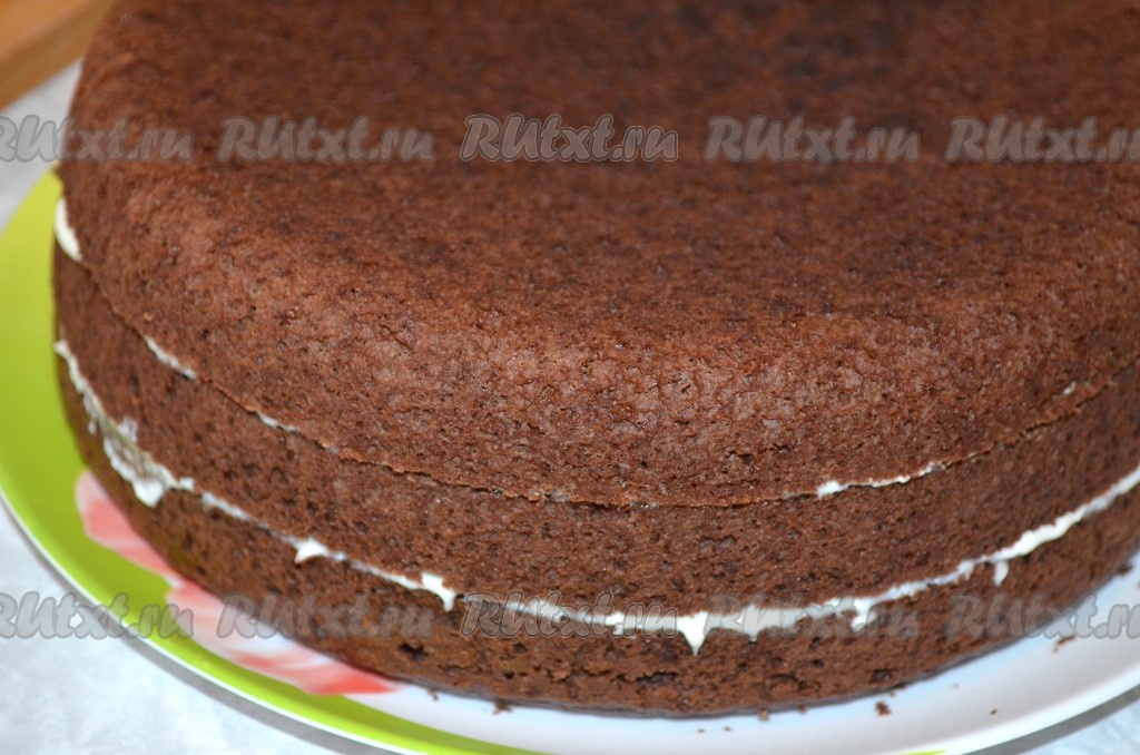 Для приготовления творожного крема тщательно перемешать творог, сметану и сахар до однородности. Если у вас творог с крупинками, то предварительно протрите его через сито. Нижний и средний коржи шоколадного торта смазать творожным кремом.
