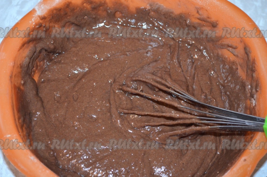 Для приготовления теста в миске смешать муку, сахар, разрыхлитель и какао-порошок.
