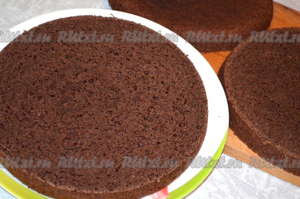 Готовый бисквит достать из формы и остудить. Затем разрезать его на 3 коржа.