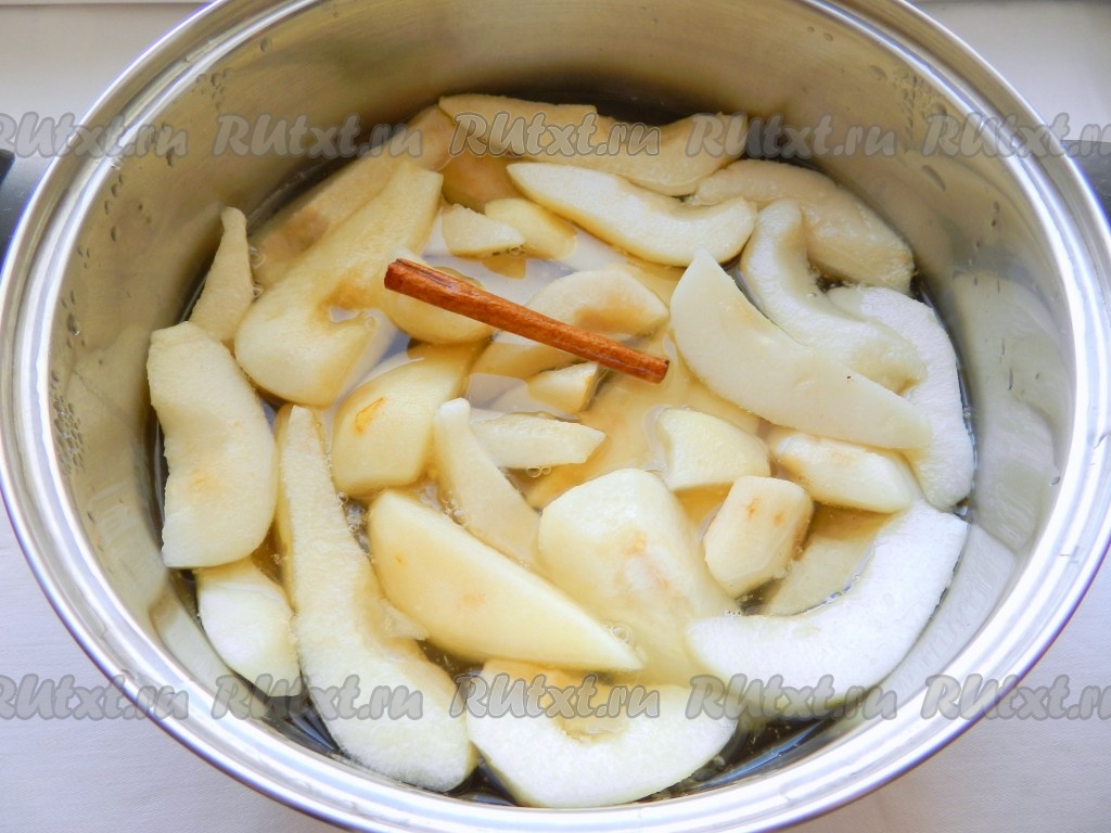 Поместить груши в сироп, добавить палочку корицы и поставить на огонь. Довести до кипения, снять образовавшуюся пенку и варить 1 час на медленном огне, не допуская сильного кипения. Кастрюлю с вареньем периодически встряхивать.