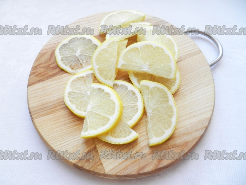 Лимон нарезать полукольцами, удалить косточки.