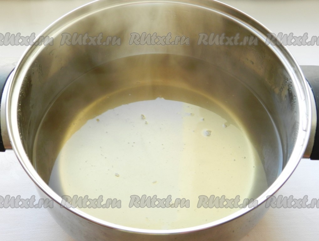 В кастрюлю налить воду, всыпать сахар и ванильный сахар и довести до кипения.