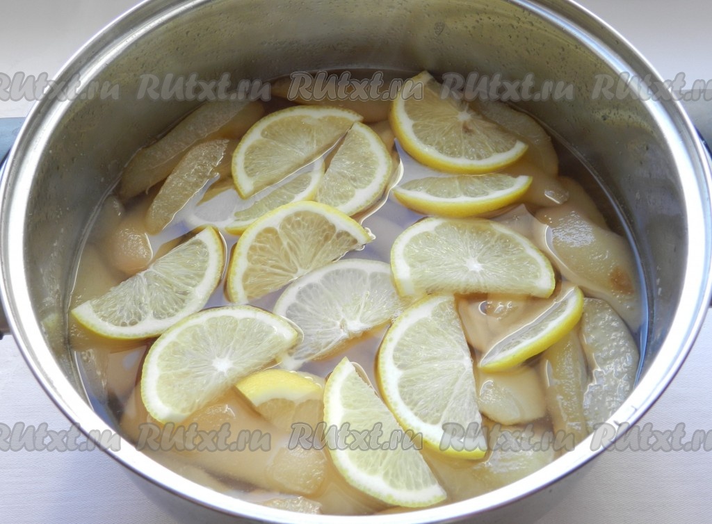 Добавить дольки лимона к грушам, довести до кипения и варить на медленном огне еще 15 минут.