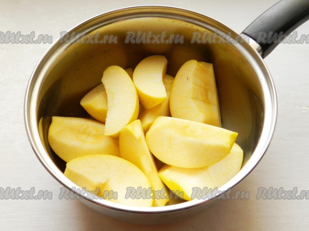 Яблоки нарезать четвертинками, очистить от сердцевины, сложить в сотейник, добавить 2 столовые ложки воды и тушить на медленном огне 20-30 минут, чтобы яблоки стали мягкими.
