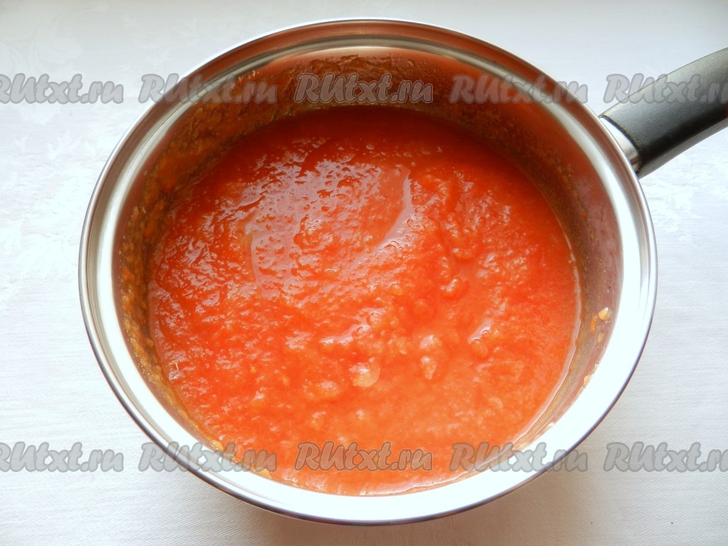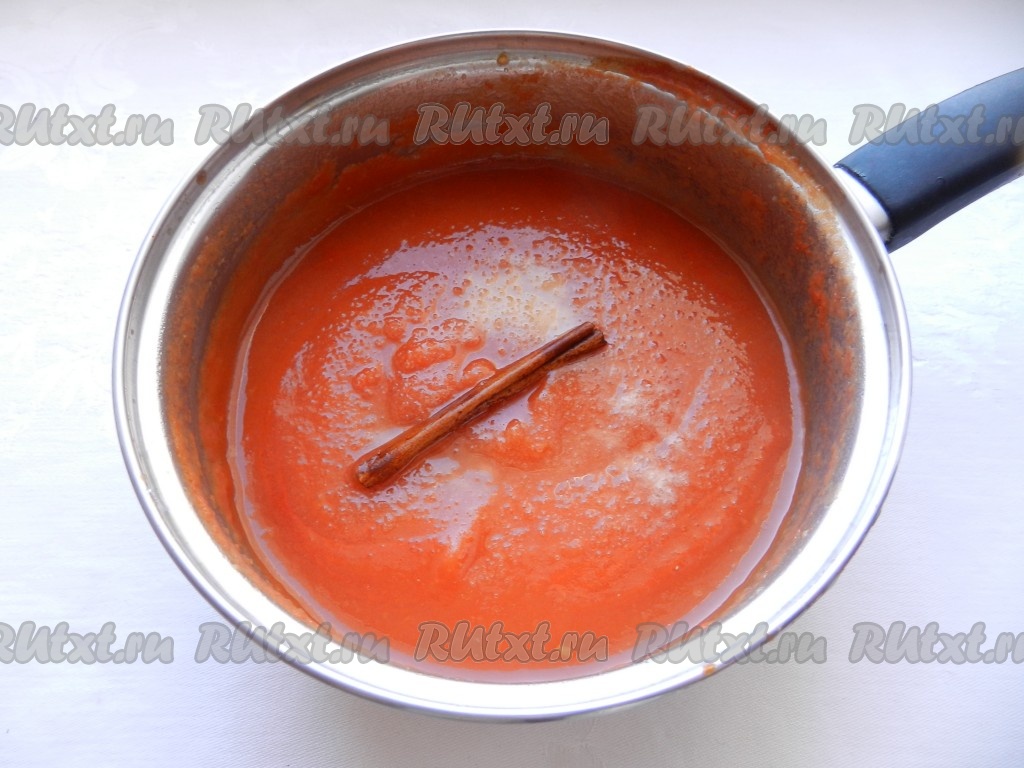 Соединить оба вида пюре - томатное и яблочное, поставить на огонь и варить 20 минут, постоянно помешивая.