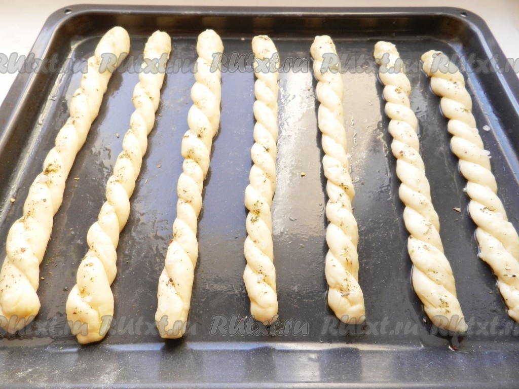 Вначале один кусочек теста скатать в длинный тонкий жгутик, затем сложить его пополам и переплести, формируя хлебную палочку. Аналогично сформировать все хлебные палочки и выложить их на противень, смазанный маслом. Каждую палочку смазать оливковым маслом, посыпать итальянскими травами и крупной солью. Оставить ещё на 15-20 минут.