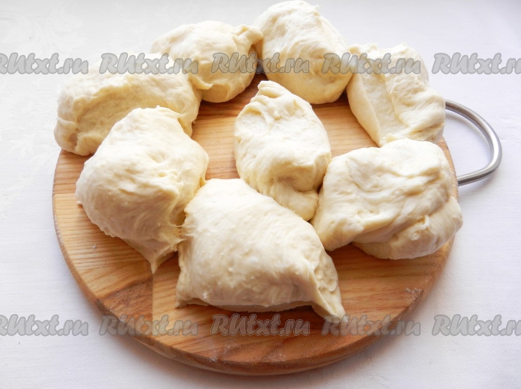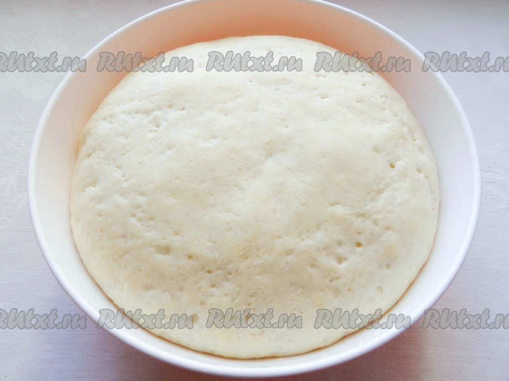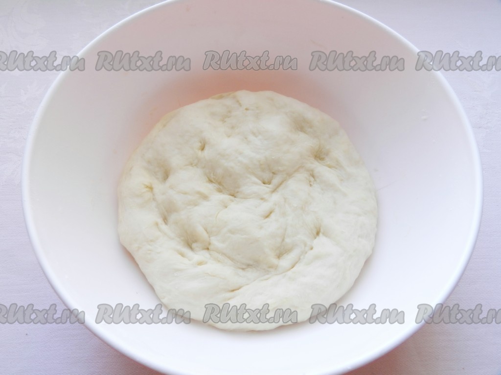 Тесто должно получиться мягким и упругим, не липнуть к рукам и посуде. Возможно, муки понадобится немного больше или меньше, ориентируйтесь на консистенцию замешиваемого теста. Накрыть миску с тестом чистым полотенцем и поставить в тёплое место для подъёма на 1 час. Подошедшее тесто обмять и оставить ещё на 20-30 минут.