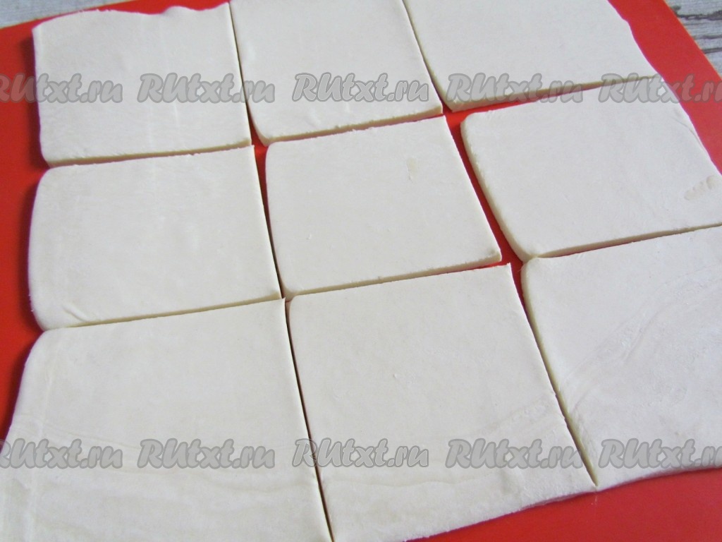 Тесто разморозьте при комнатной температуре, накрыв полотенцем. Слегка раскатайте и нарежьте на квадраты.