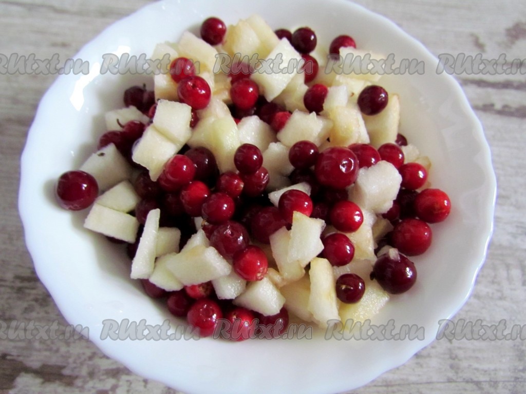 Бруснику переберите, промойте, просушите и смешайте с нарезанным яблоком. Замороженные ягоды предварительно разморозьте.