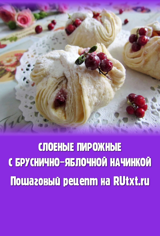 Подобные пирожные - частые гости на нашем семейном повседневном столе. Готовить их очень просто и быстро. Понадобятся готовое слоеное тесто и любая начинка. Это могут быть фрукты или ягоды, густые джемы или повидло, вареная сгущенка, смешанная с орехами, или творог. Каждый раз стараюсь использовать разные начинки, поэтому эти пирожные не надоедают моим близким и всегда съедаются с большим удовольствием. Сегодня к вечернему чаепитию пирожные с бруснично-яблочной начинкой.