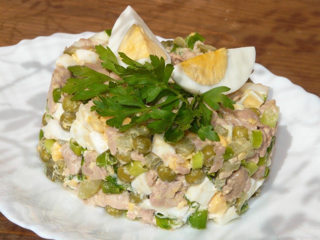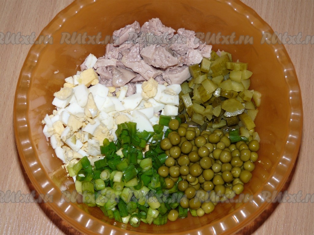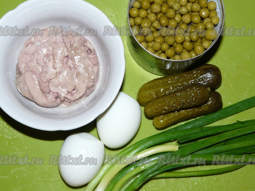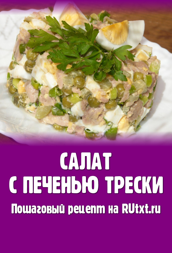 Вкусный, аппетитный салат, приготовленный с печенью трески и зелёным горошком, можно подать в салатнике или порционно, придав ему форму с помощью сервировочного кольца.