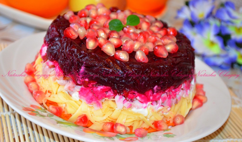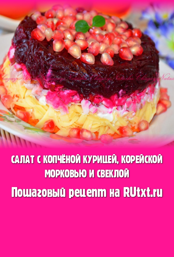 На плоскую тарелку выложить первым слоем корейскую морковь, смазать майонезом, затем выложить слой сыра, тоже промазать немного майонезом, следующим слоем равномерно распределить копчёную курицу, смазать майонезом, выложить свеклу. Смазывать майонезом свекольный слой не нужно. Украсить салат, приготовленный с копчёной курицей и корейской морковью (я украсила зёрнами граната). Надеюсь, вы по достоинству оцените рецепт этого вкусного блюда.