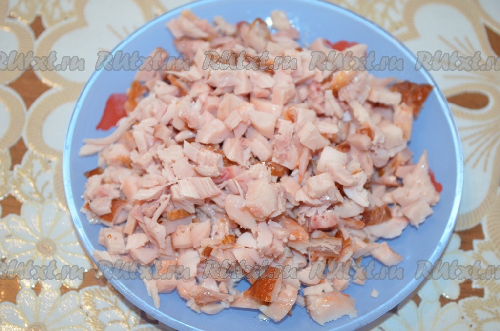 Копчёное мясо можно взять с любых частей курицы. 150 грамм мяса курицы, отделённого от костей, нарезать мелко.