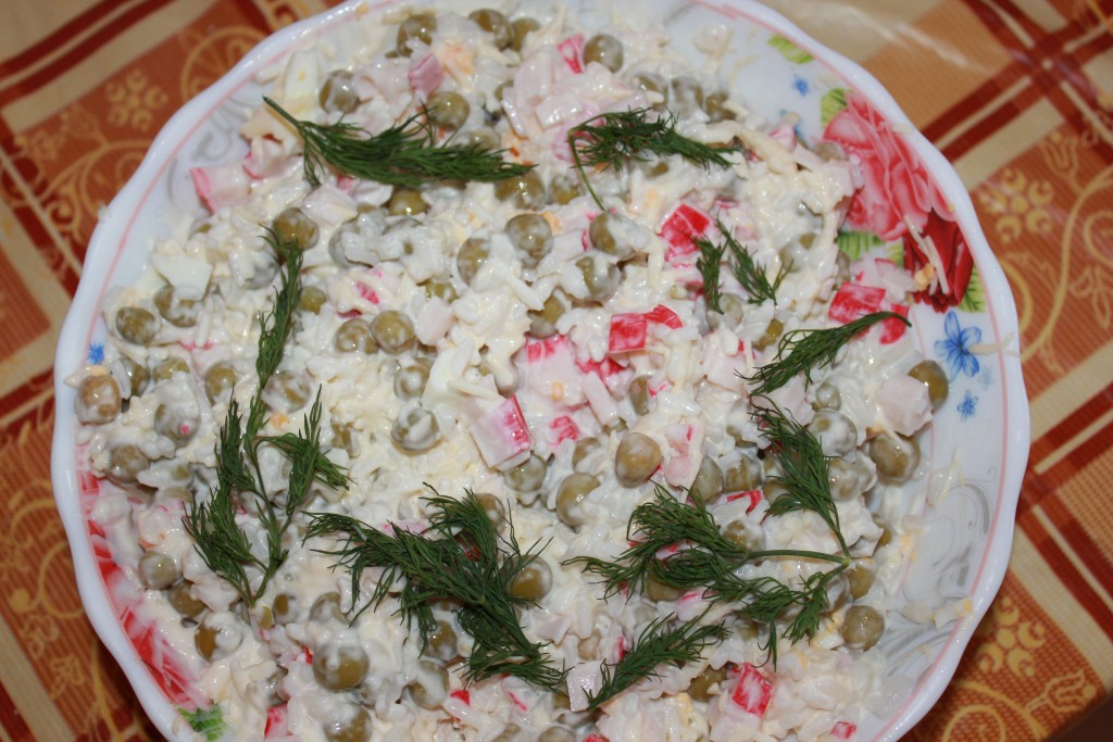 И тщательно перемешиваем крабовый салат с горошком. Можно украсить зеленью.