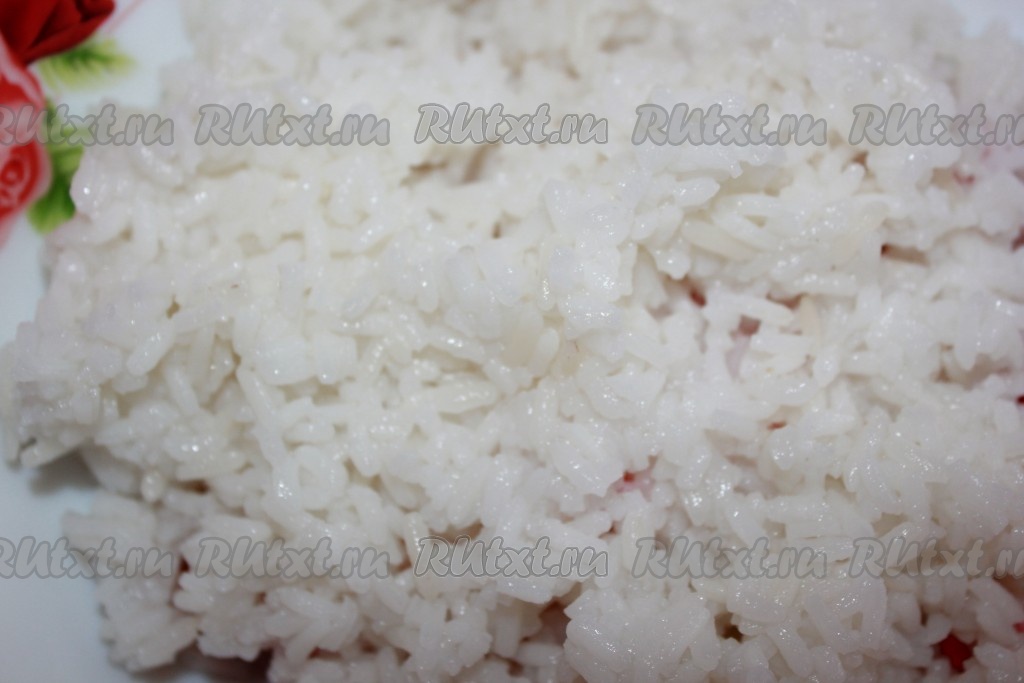 Отвариваем рис, остужаем, добавляем в крабовые палочки.