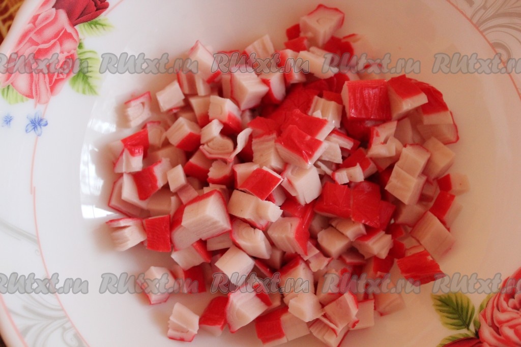 Крабовые палочки режем на мелкие кубики.