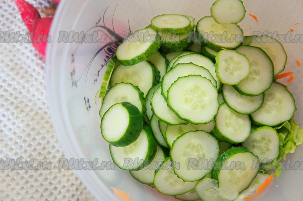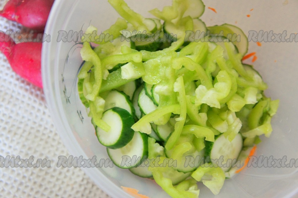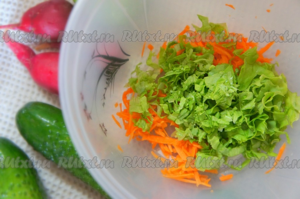 Огурцы и редиску вымыть, отрезать кончики у этих овощей с двух сторон. Удалить плодоножку с семенами из болгарского перца. Морковь очистить, натереть на крупной тёрке, выложить в миску. Листья салата вымыть, обсушить, нарвать руками (или нарезать), выложить в миску с морковкой.