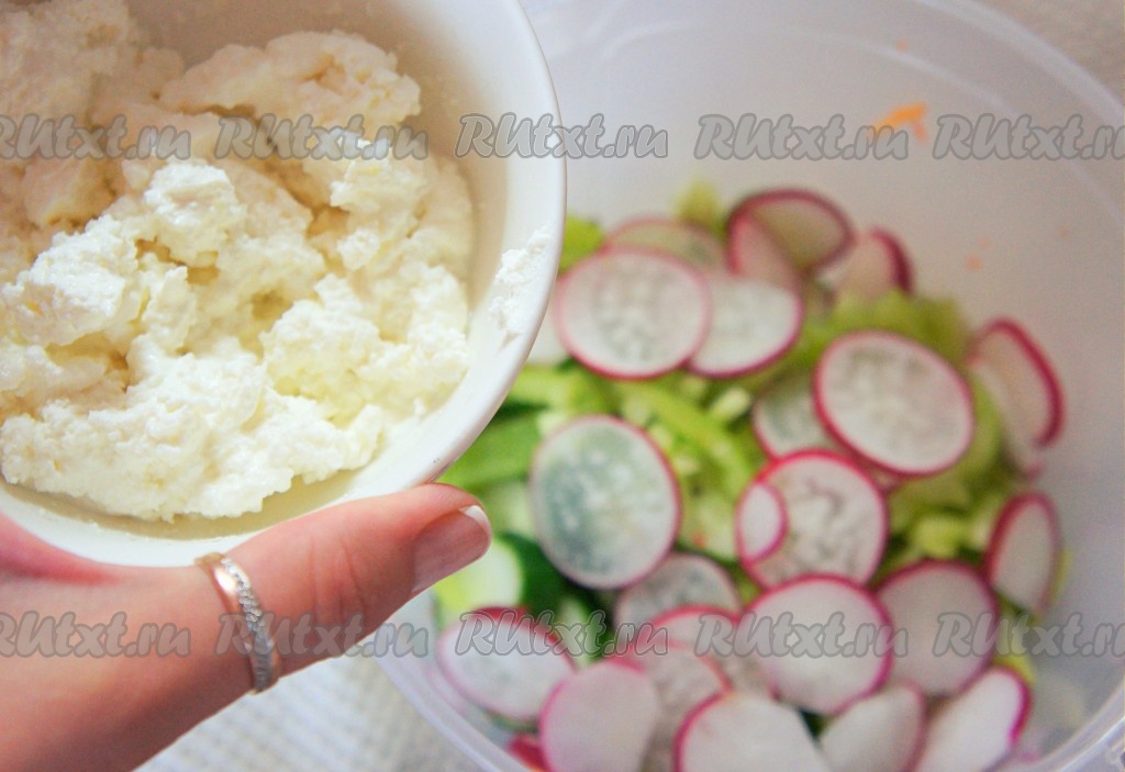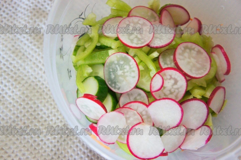 Добавить тонко нарезанный редис.