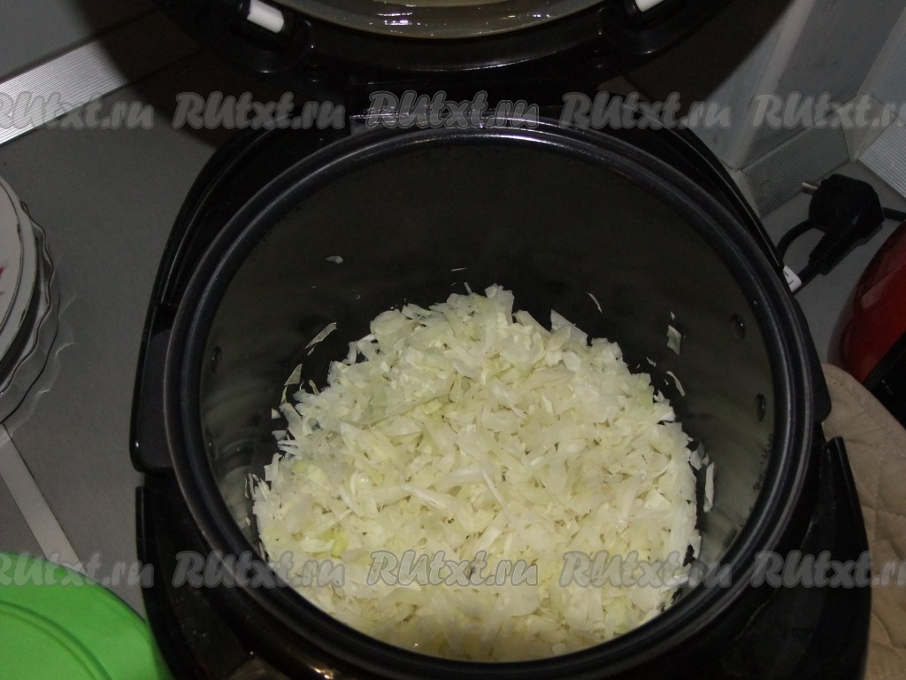 Пока варится рис, мелко режем капусту и тушим до светло-коричневого цвета.