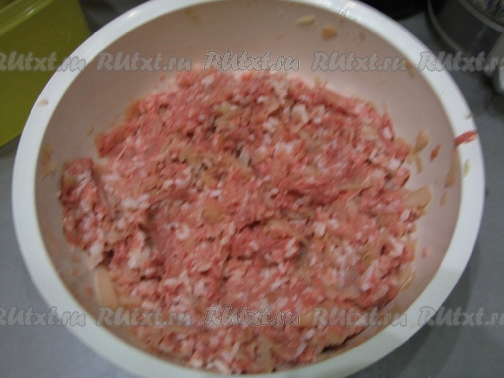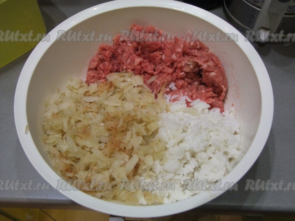 Смешиваем рис, фарш и капусту, солим.