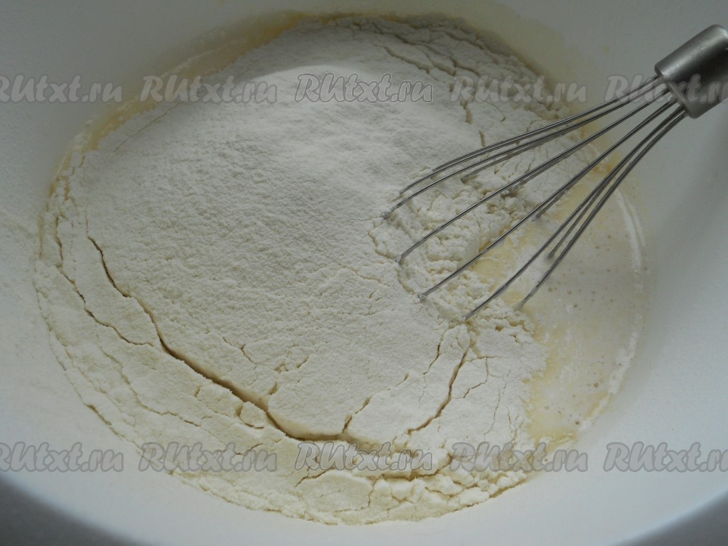 Влить кефир, перемешать и всыпать просеянную муку с разрыхлителем. Перемешать хорошо венчиком до образования однородного теста (тесто консистенции, как на оладьи).